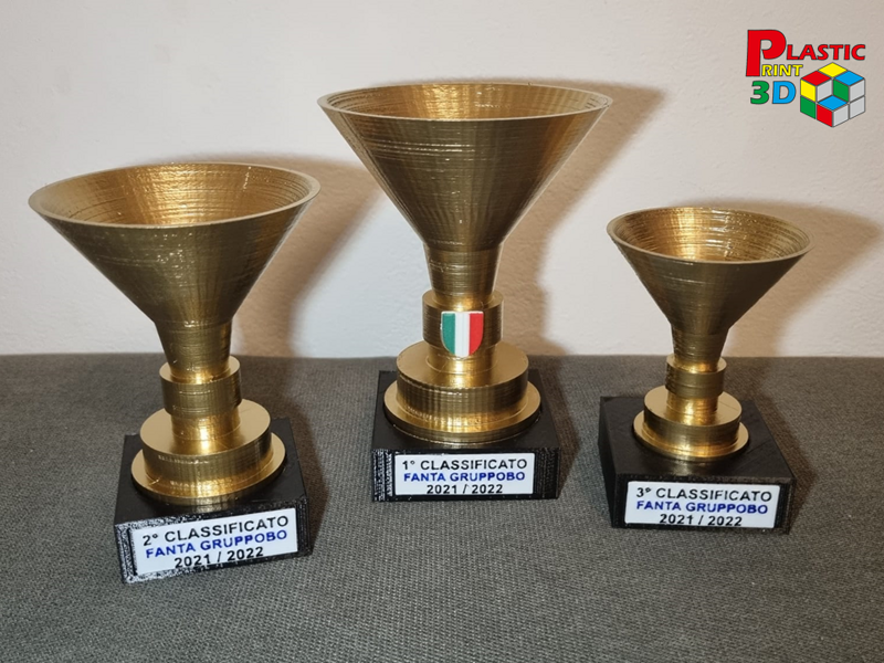 L'altezza specificata tra le varianti si intende comprensiva di base nera con la relativa targhetta personalizzata. E' possibile aggiungere il badge tricolore sul frontale del trofeo selezionando la variante corrispondente.